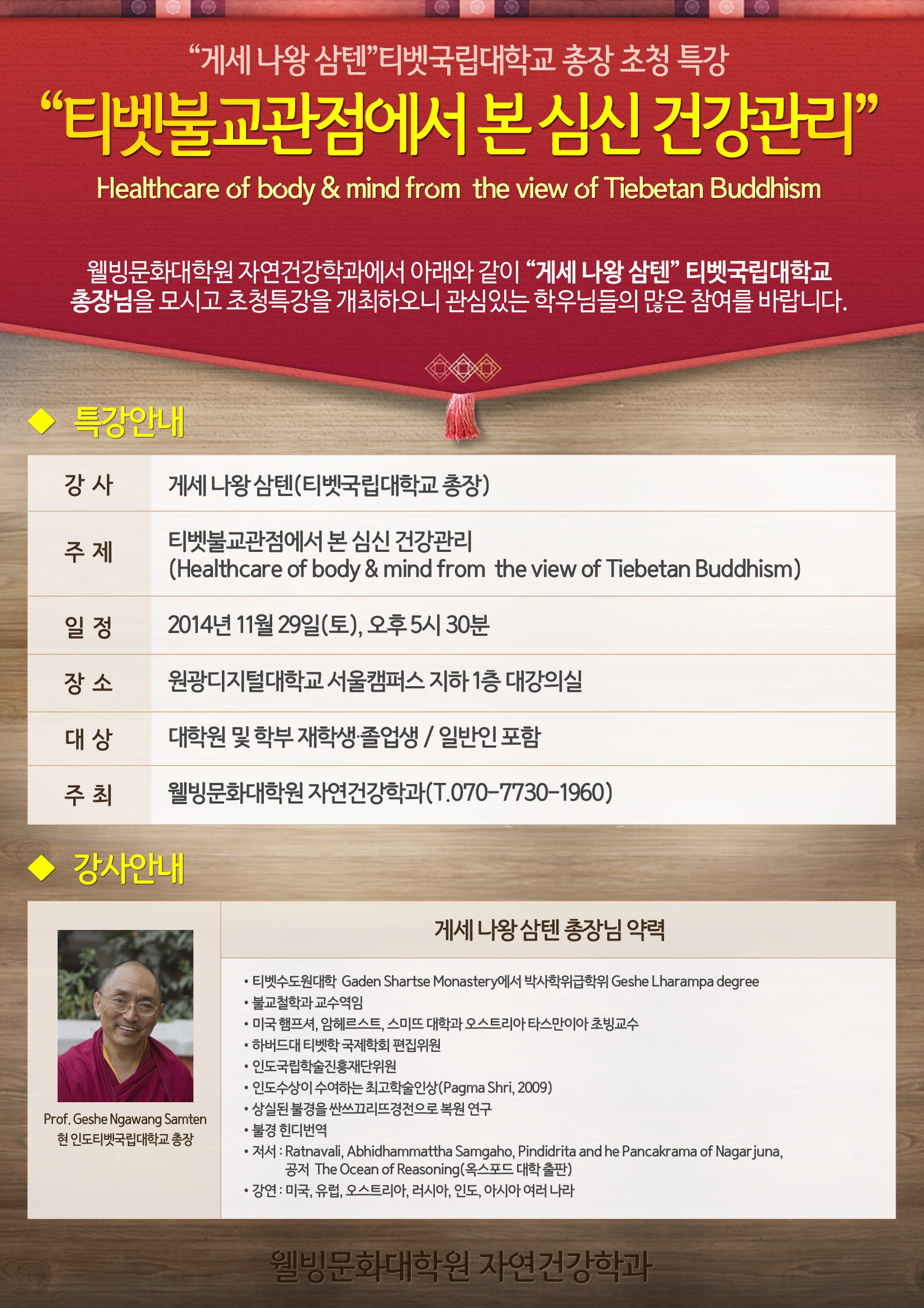 [특강안내] 게세 나왕 삼텐 티벳국립대학교 총장 초청 특강 안내