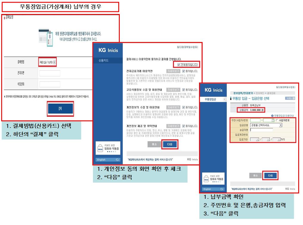 2) 무통장(가상계좌) 선택 후 등록금 납부방법