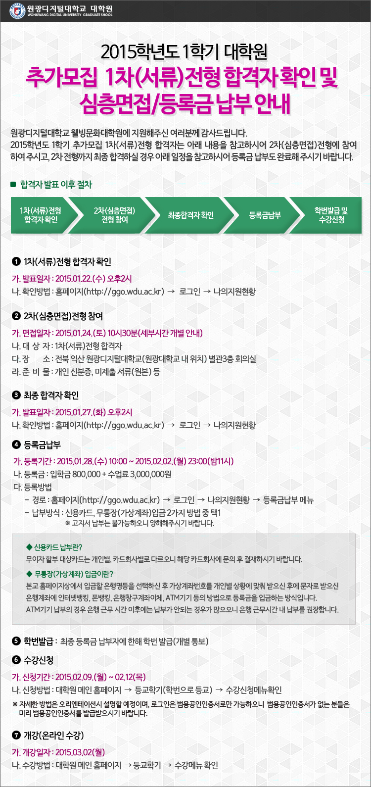 '15.1학기 추가모집 1차(서류)합격자 확인 및 면접,등록금 납부 안내